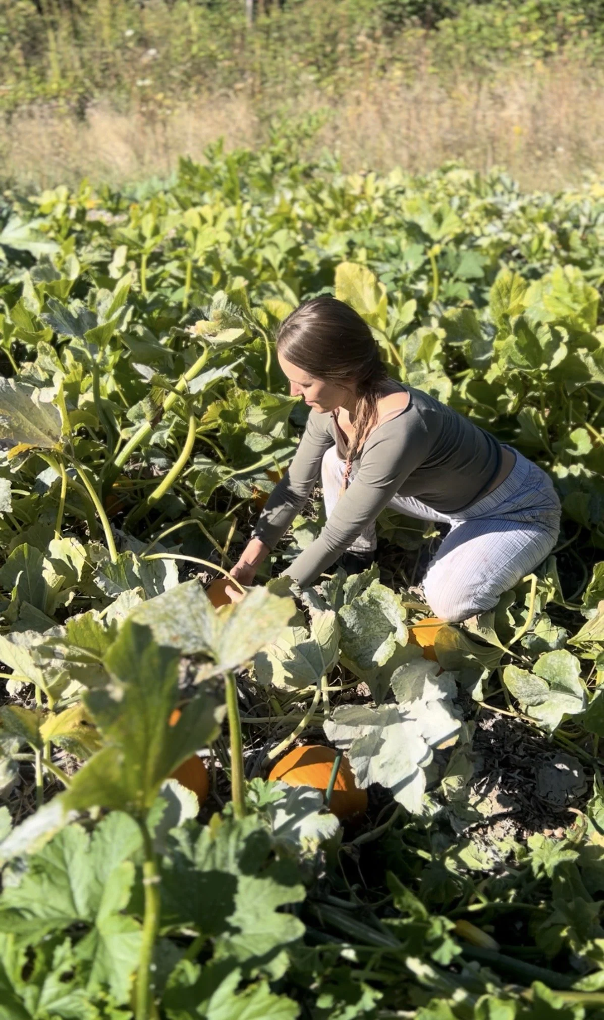 Chef Paige harvesting a pumpkin for homemade pumpkin pie <3