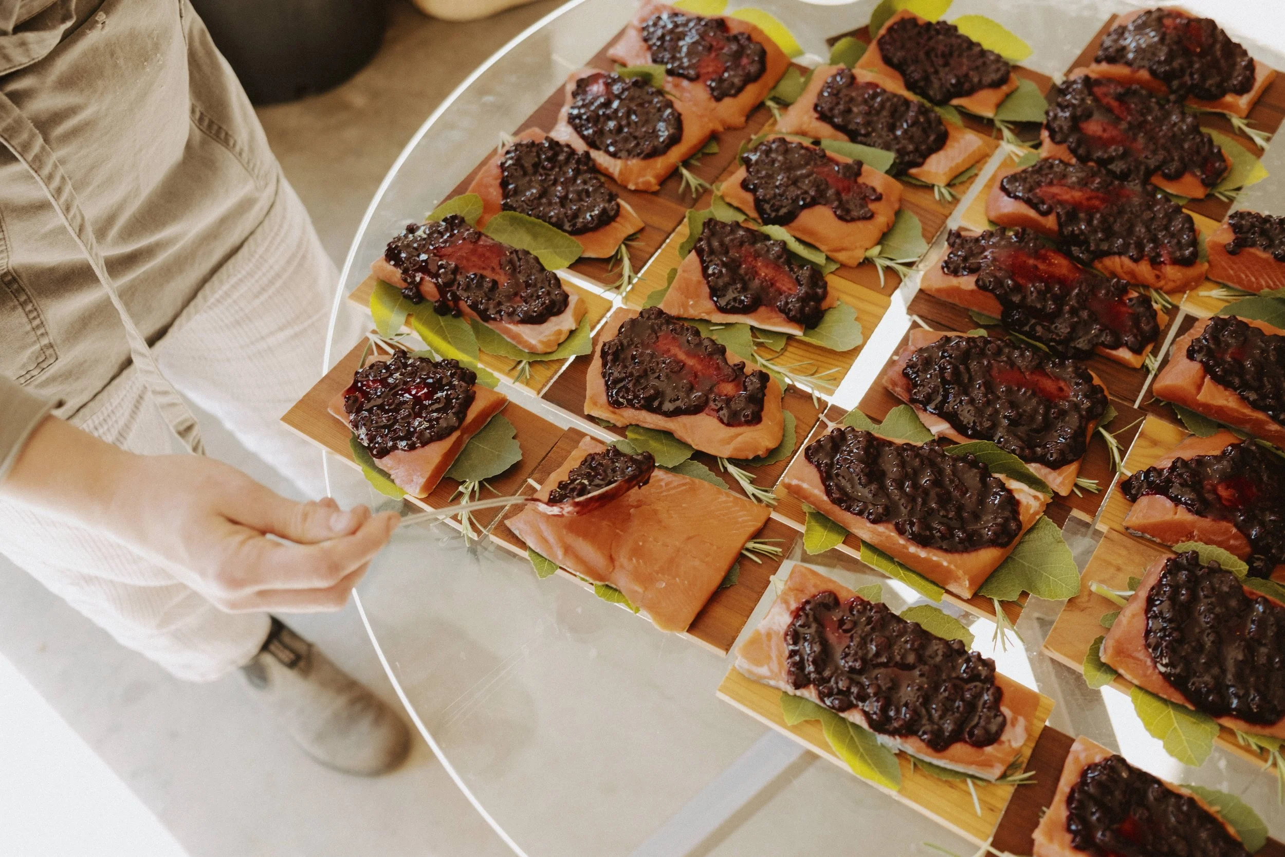 Chef Paige about to grill wild native caught chinook salmon with huckleberry glaze on a fig leaf/ rosemary sprig on cedar planks