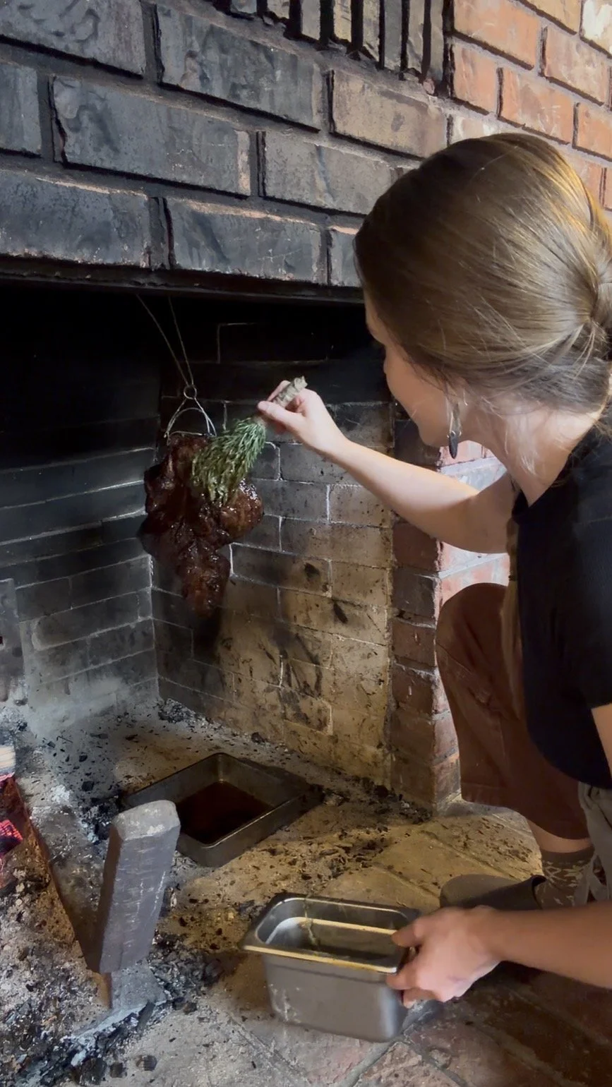 Chef Paige preparing a wild freshly hunted deer leg over an open flame basting melted bone marrow with a rosemary brush